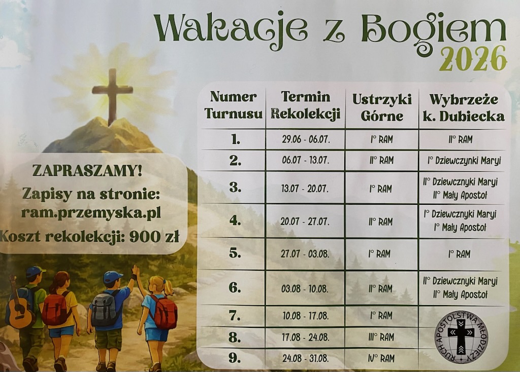 Ruch Apostolstwa Młodzieży zaprasza dzieci i młodzież na Wakacje z Bogiem. W ofercie znajdują się tygodniowe turnusy w Wybrzeżu koło Dubiecka i w Ustrzykach Górnych. Koszt 900 zł. Zapisy od 4 maja. Więcej informacji na plakacie i na stronie ram.przemyska.pl